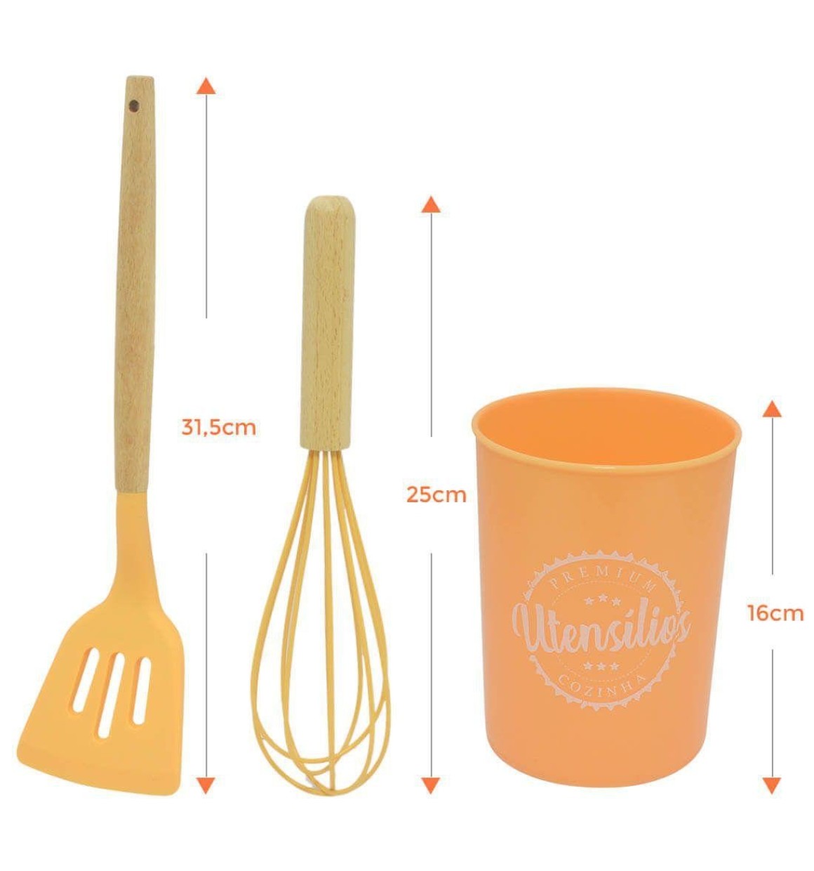 - Conjunto de utensílios revestido em silicone e cabo de madeira;
