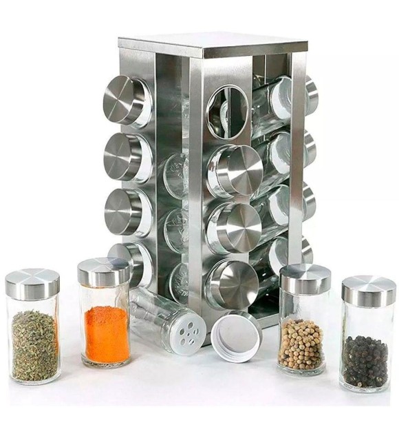 Jogo Porta Temperos de Inox Giratório Quadrado com 16 Potes