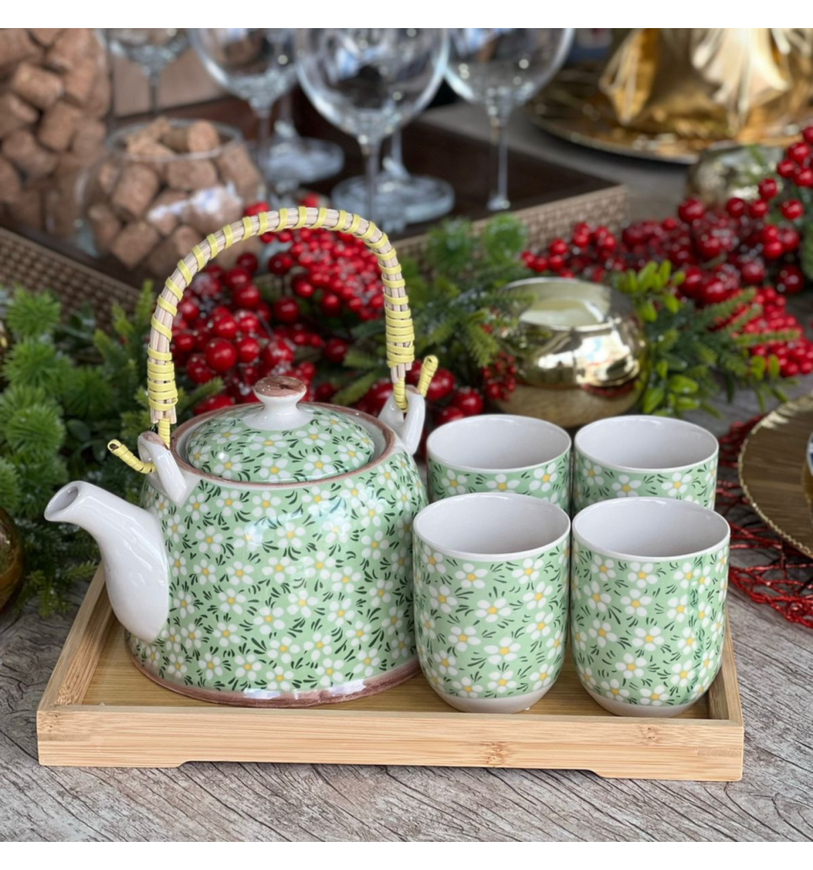 Bule de porcelana decorativa estilo oriental com decoração floral e alça de bambu trançado. acompanha tampa e infusor que se encaixa na borda, facilitando o preparo do chá. alça e coador removivel para lavagem.