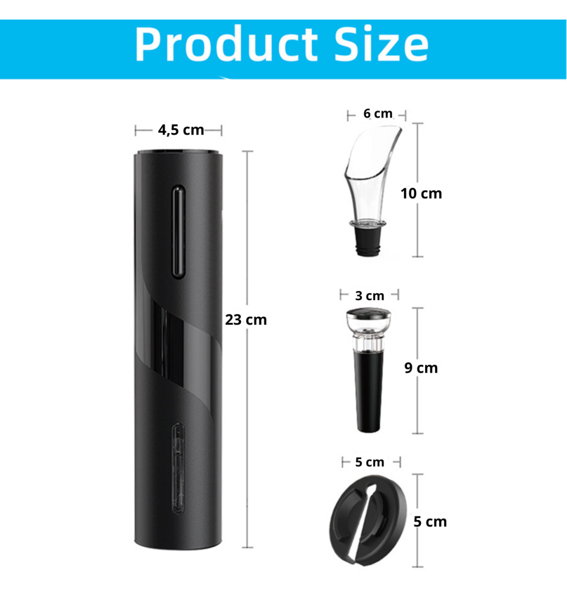 O Abridor de vinhos automático possui um punho ergonômico para fácil manuseio projetado para caber em todas as garrafas de vinho tradicionais, basta clicar no botão e a rolha é removida automaticamente com as mãos livres