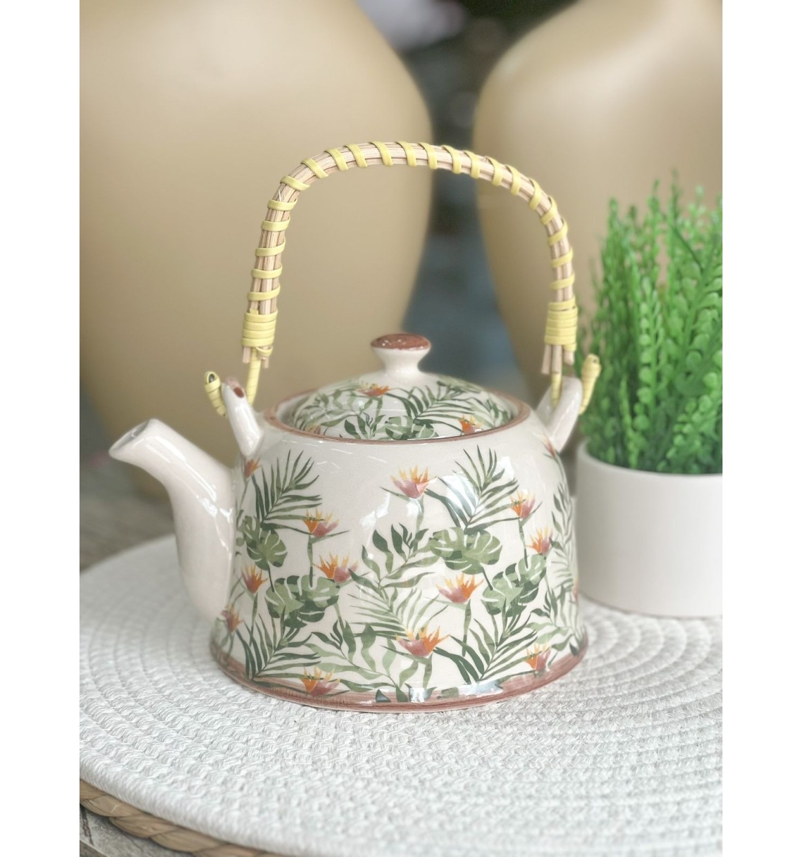 Bule de porcelana decorativa estilo oriental com alça de bambu trançado. acompanha tampa e infusor que se encaixa na borda, facilitando o preparo do chá. Alça e coador removivel para lavagem.