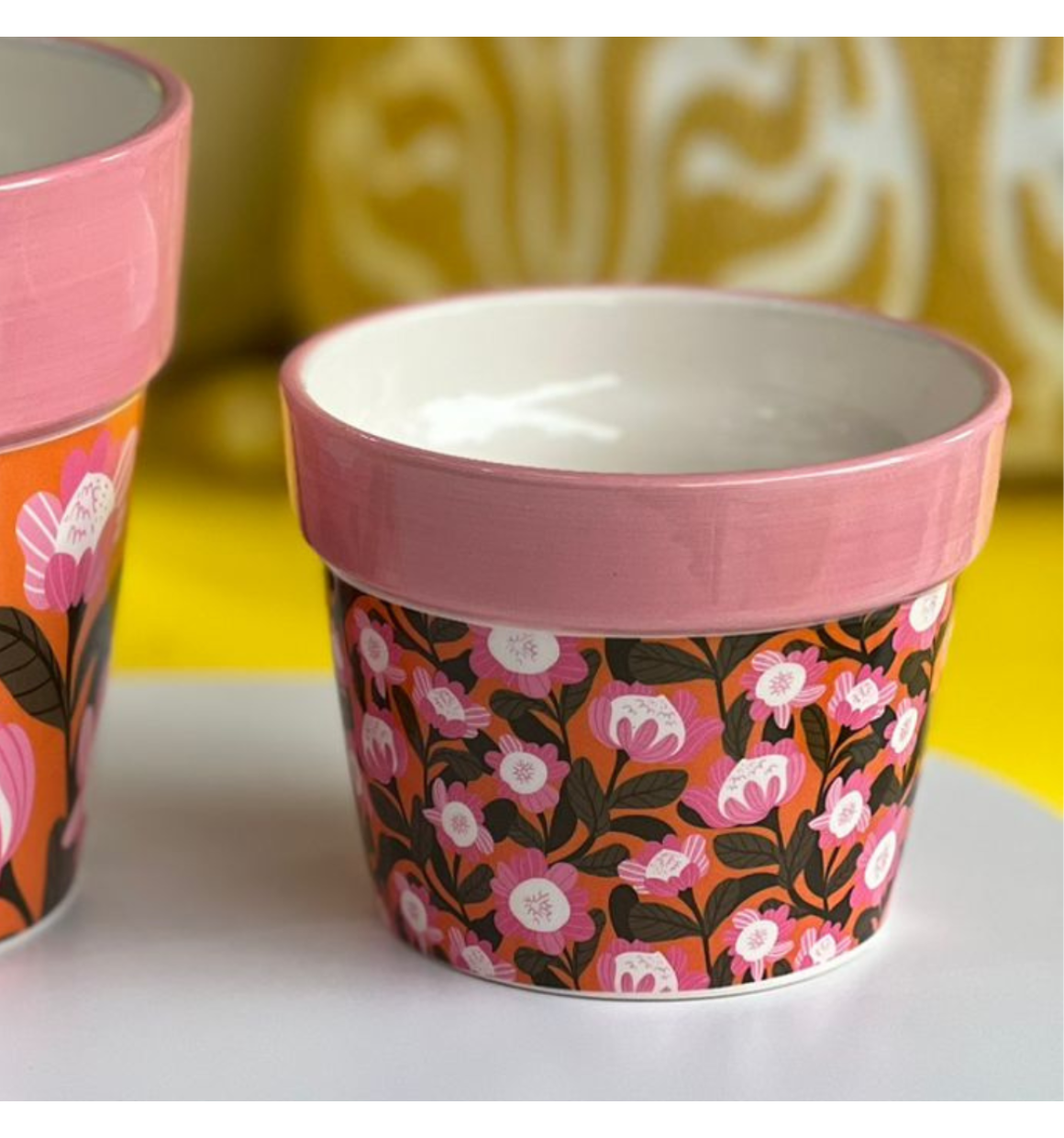 Vaso em Porcelana , fundo em branco e borda em Rosa, decorado com florzinhas . Não há furos no fundo do vaso. Indicado apenas para uso interno, devido ao tipo de pintura/material