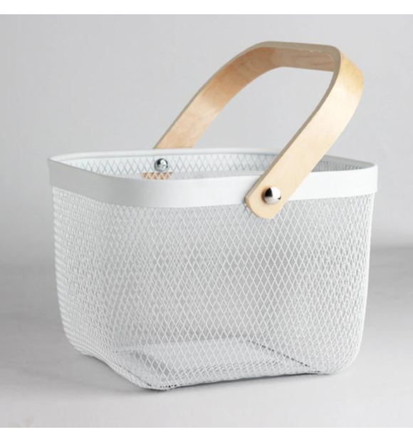 Cesta /Fruteira Branca de Metal com Alça de Madeira - "Quadrada"