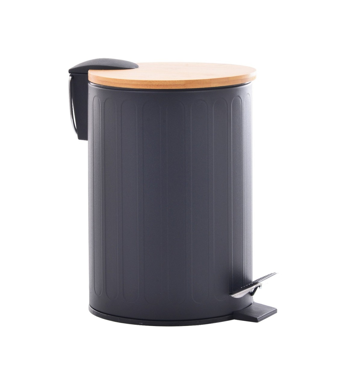 Lixeira 3L Preta com Tampa de Bambu com Pedal Canelada