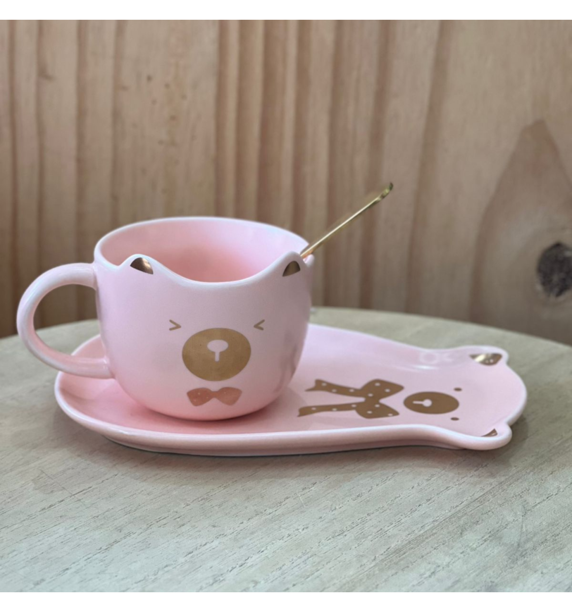 - Xicara de Cerâmica Rosa ''Ursinho'' com Pires em formato de urso polar + Colher de Metal - 220ml