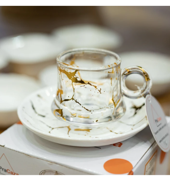 Xicara de Vidro com  Pires de Porcelana Marmorizada - 60ml
