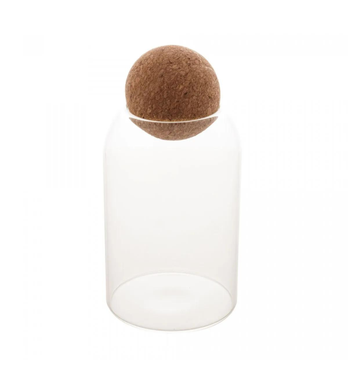 feito de vidro borossilicato de alta qualidade, torna mais fino, mais leve, capaz de resistir a choques térmicos, arranhões e quebras. A tampa redonda de cortiça é feita de madeira natural e no formato de Esfera.