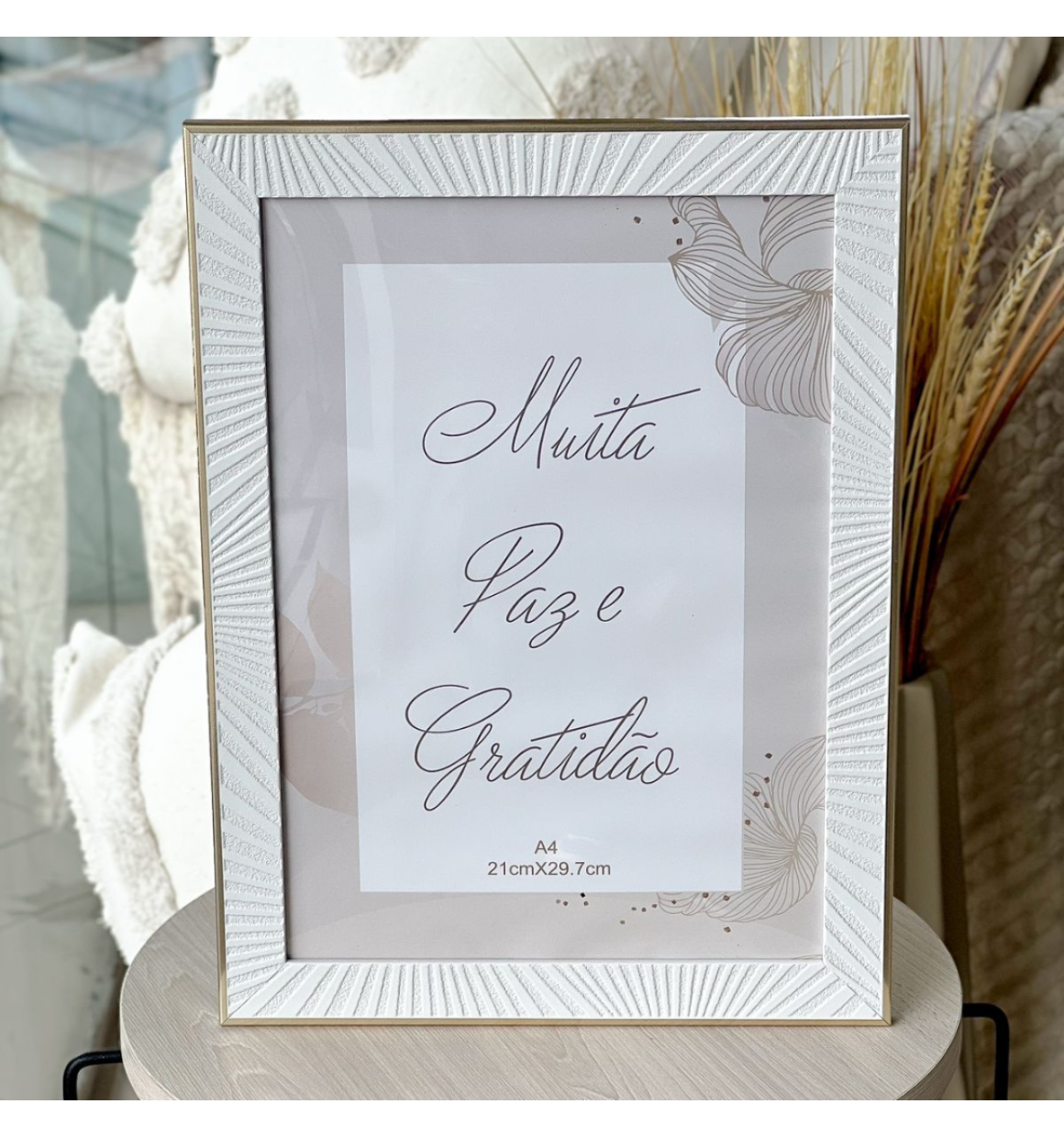 Porta Retrato Branco c/ Moldura Dourada "Muita , Paz e Gratidão" A4 - 21cm X 29.7cm