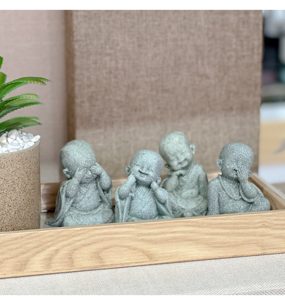 O Quarteto Budinhas Sábios, são confeccionados em Resina, Material Resistente, e confere um acabamento fino, de extrema Beleza.