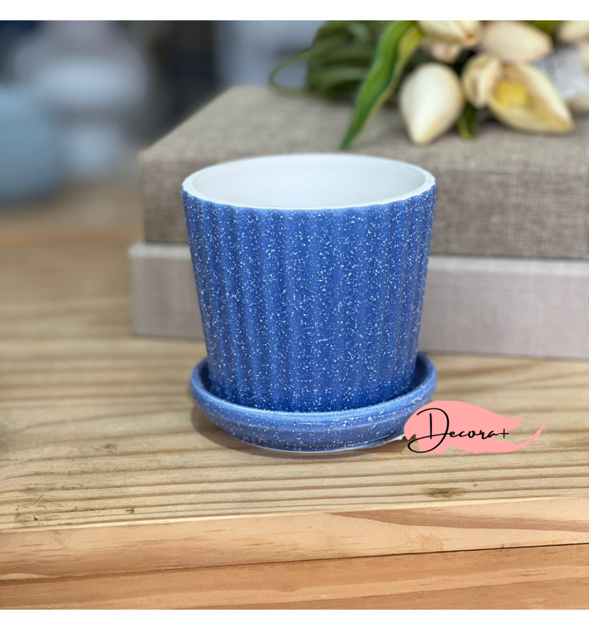 Vaso de Cerâmica Texturizado com Prato Azul Escuro - 10cm X 10cm
