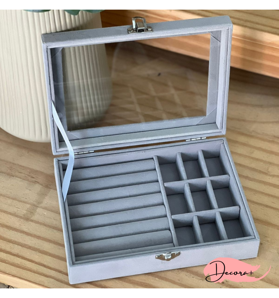 Para suas joias mais preciosas, um porta-joias à altura! O acabamento em veludo Cinza e a tampa de vidro deste Porta Joias proporcionam uma combinação perfeita de elegância e praticidade, protegendo suas peças e as exibindo de forma encantadora.