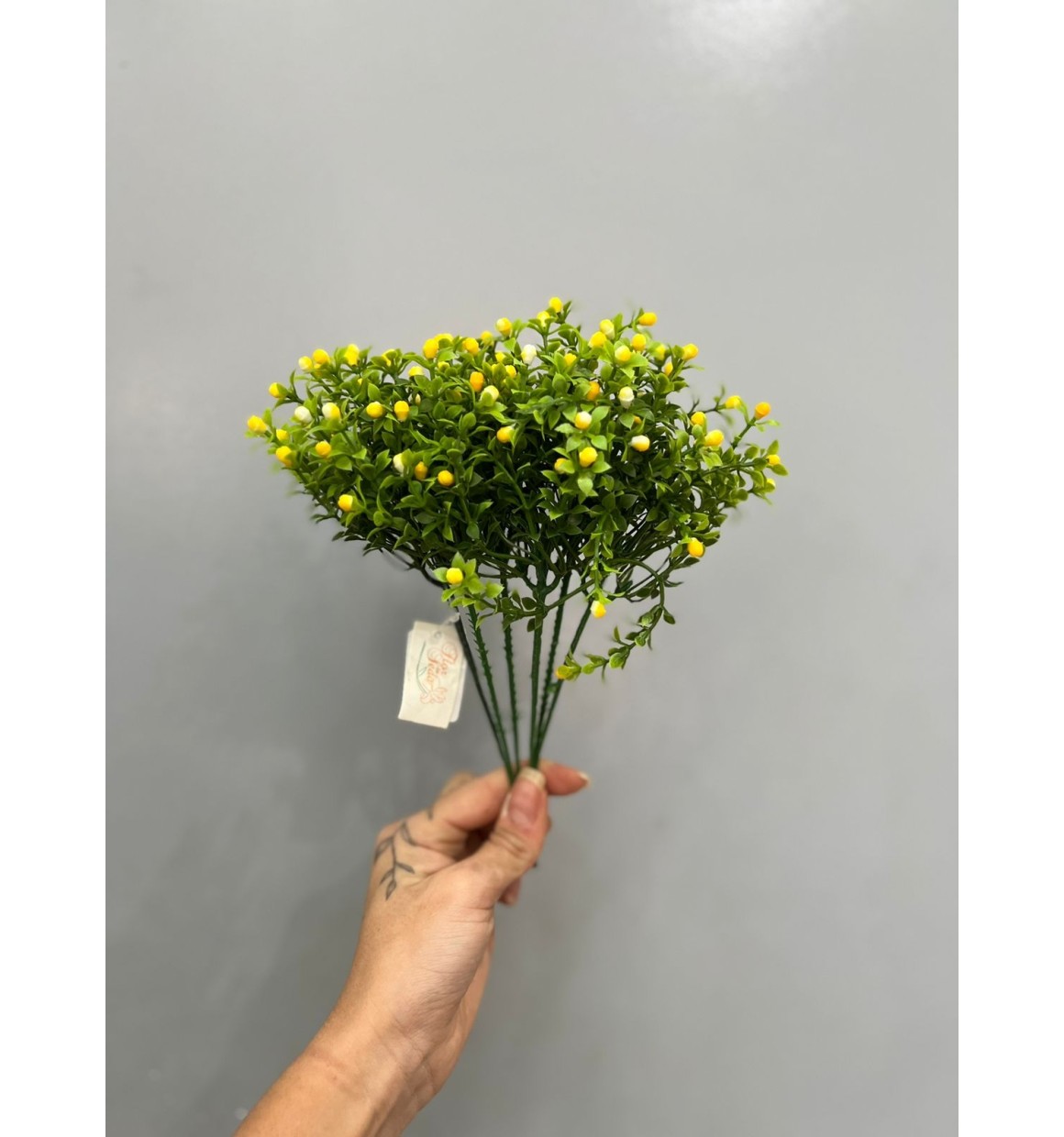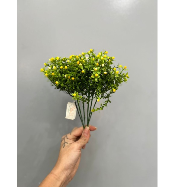 Com suas folhagens verdes e frutinhos amarelos vibrantes, o Pick Verde Frutinhos Amarelo - 25cm (Artificial) é a escolha perfeita para quem quer uma decoração leve e cheia de vida.