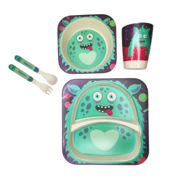 1 prato com divisórias 21cm, 1 tigela 14cm ,1 copo 9,5cm 1 garfo e 1 colher de 13cm .