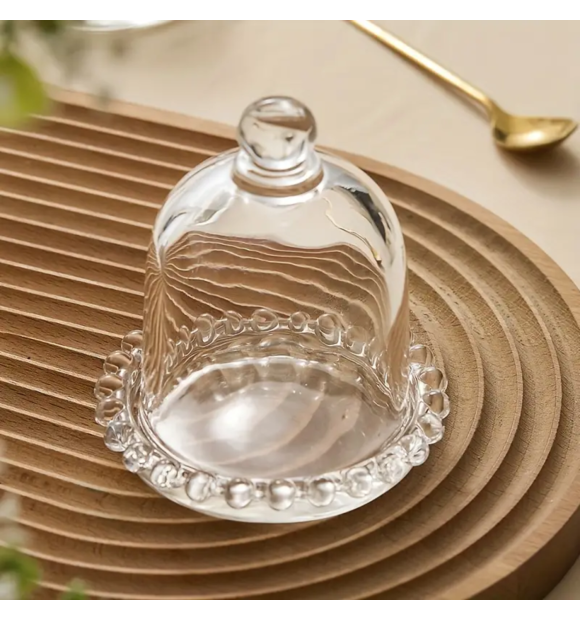 Pote de Vidro, acompanha pratinho com detalhes de bolinha e tampa de vidro