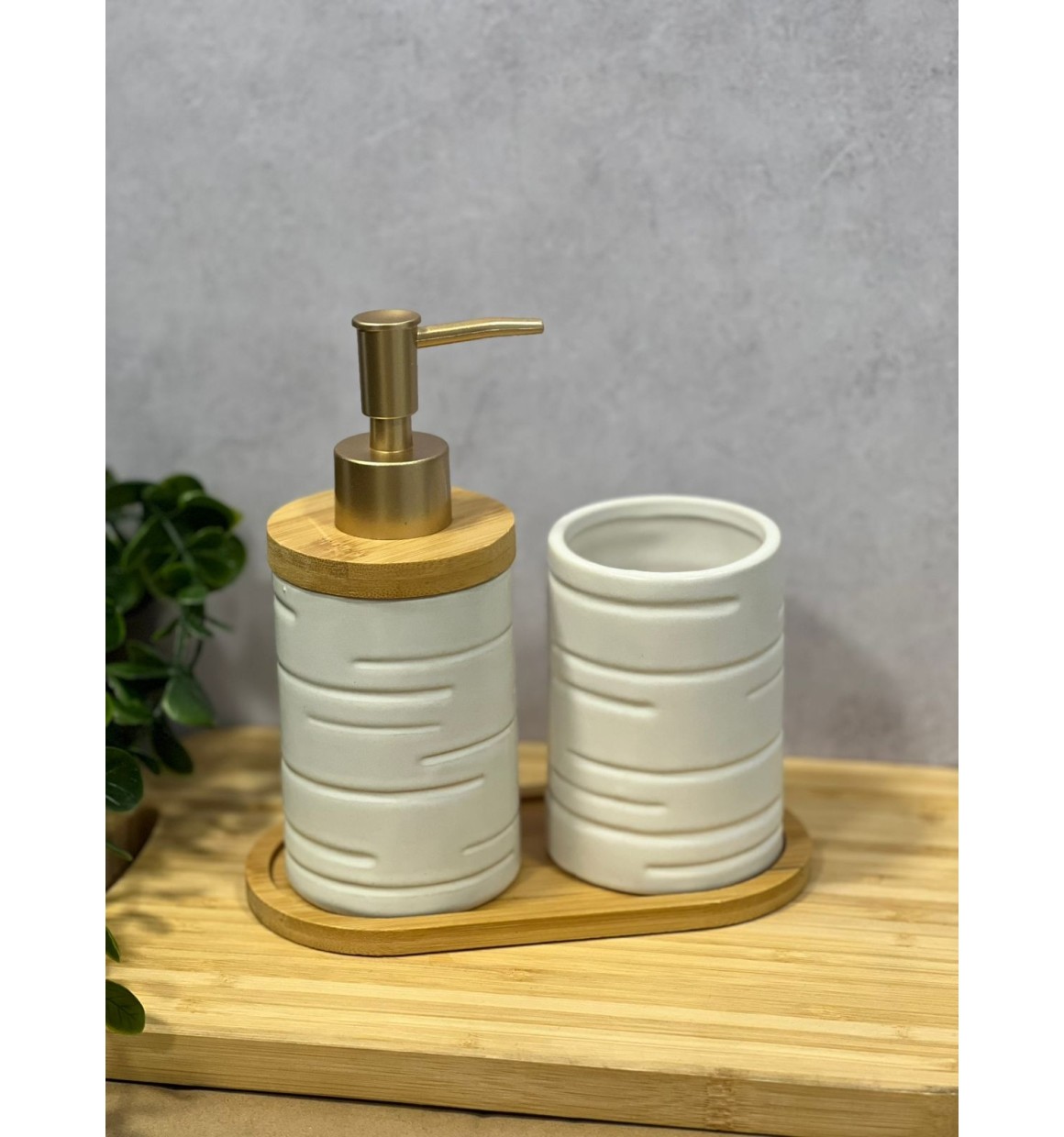 Kit de Banheiro Branco de Porcelana e Bambu - 3 Peças