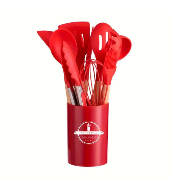Esse kit com 12 peças une a beleza do cabo de madeira com a praticidade do silicone vermelho. Resistente ao calor, fácil de limpar e super elegante, ele tem tudo que você precisa - Esse kit vem com tudo: batedor, espátulas, pegador, conchas e até balde organizador. Um combo perfeito pra quem ama praticidade e design.