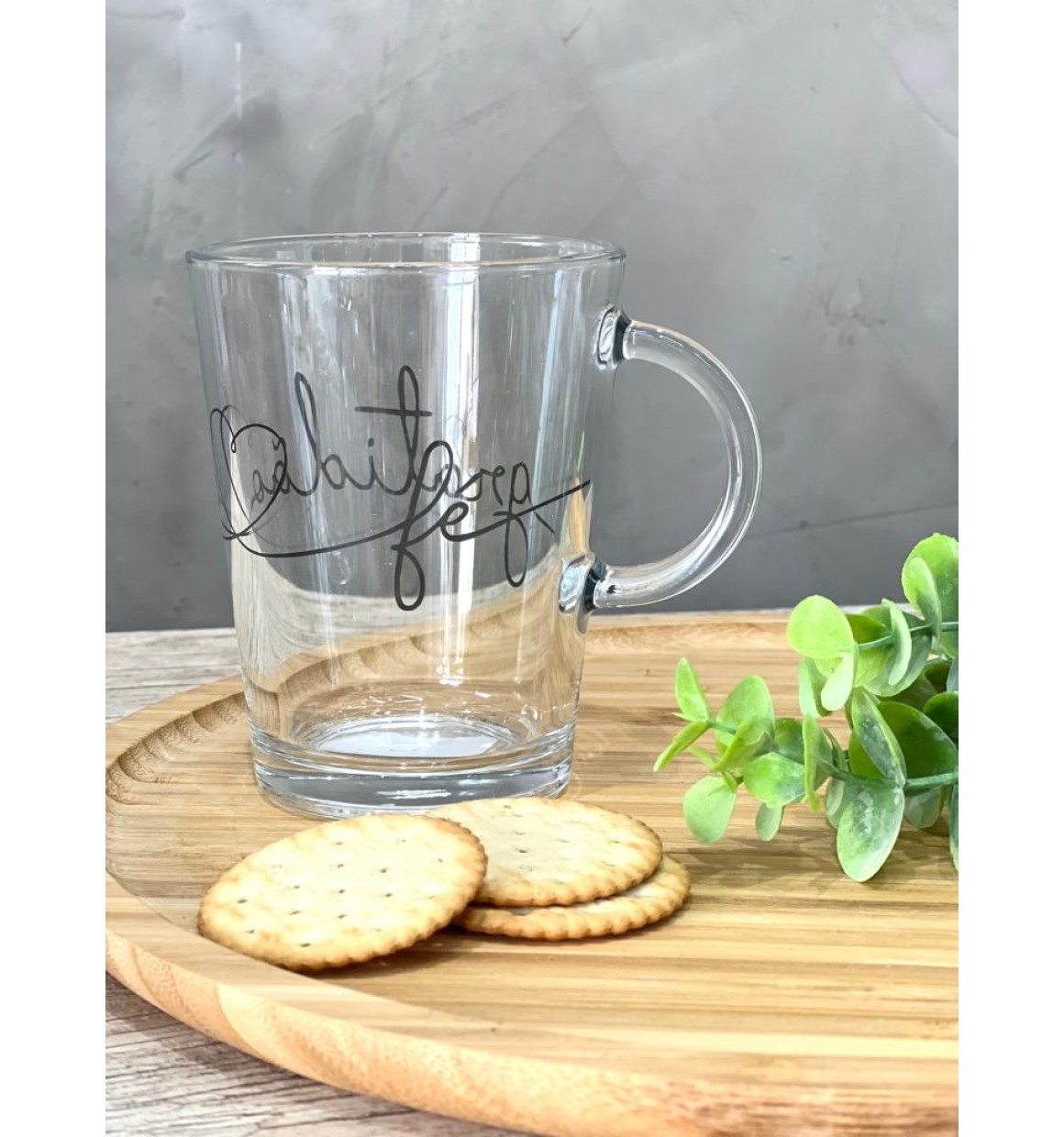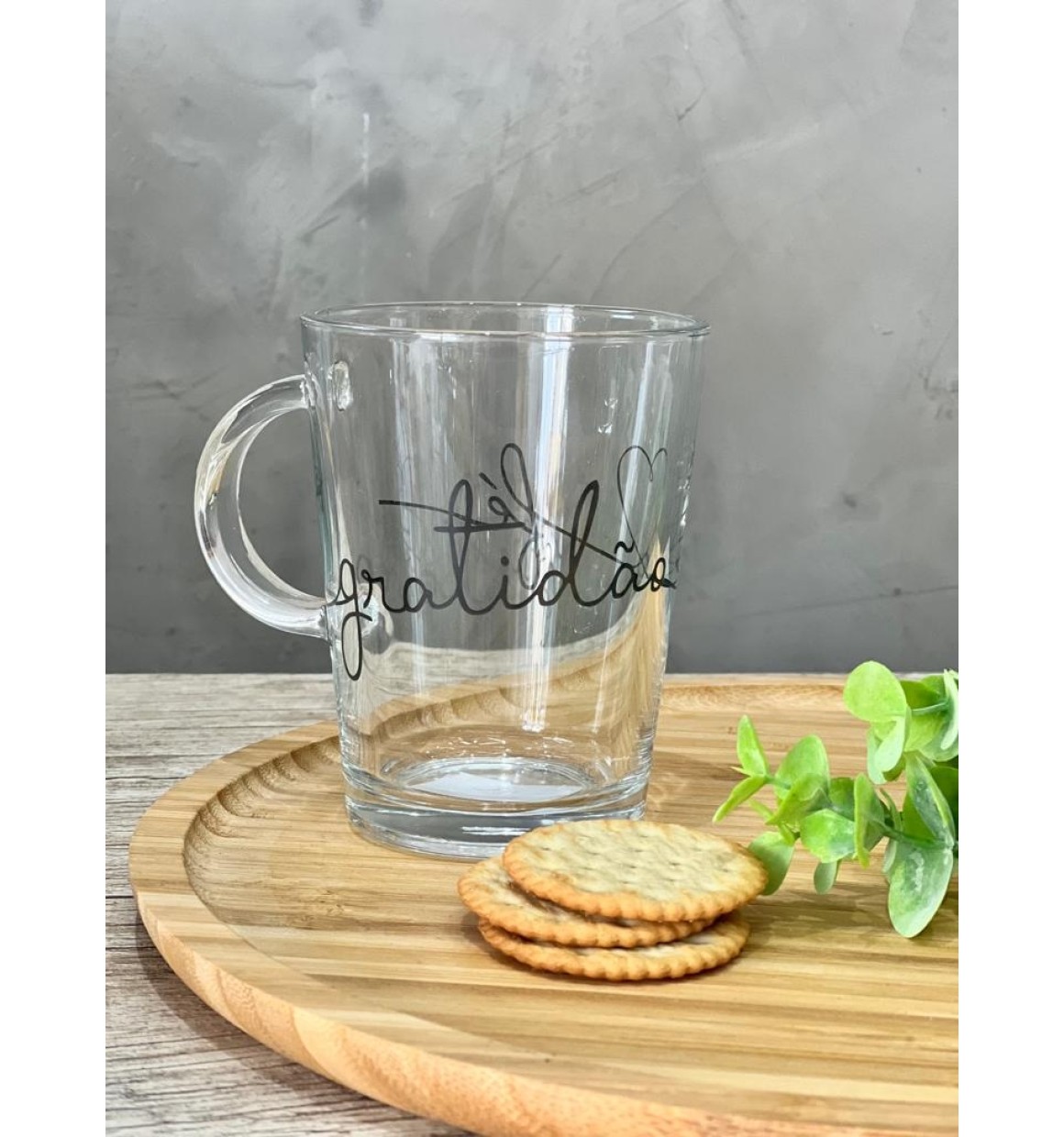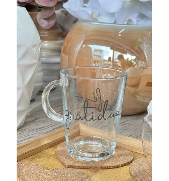 Caneca em vidro transparente , inscrição Gratidão/Fé em um lado.