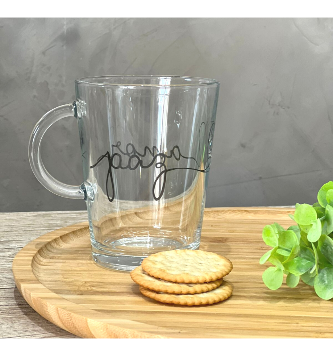 Super fofa, esta caneca é feita em vidro e tem estampa linda com as palavras: “paz” e “amor” em letras cursivas na cor preta. Ideal para usar na cozinha, sala de jantar, copa, varanda gourmet, espaço home office e muito mais!