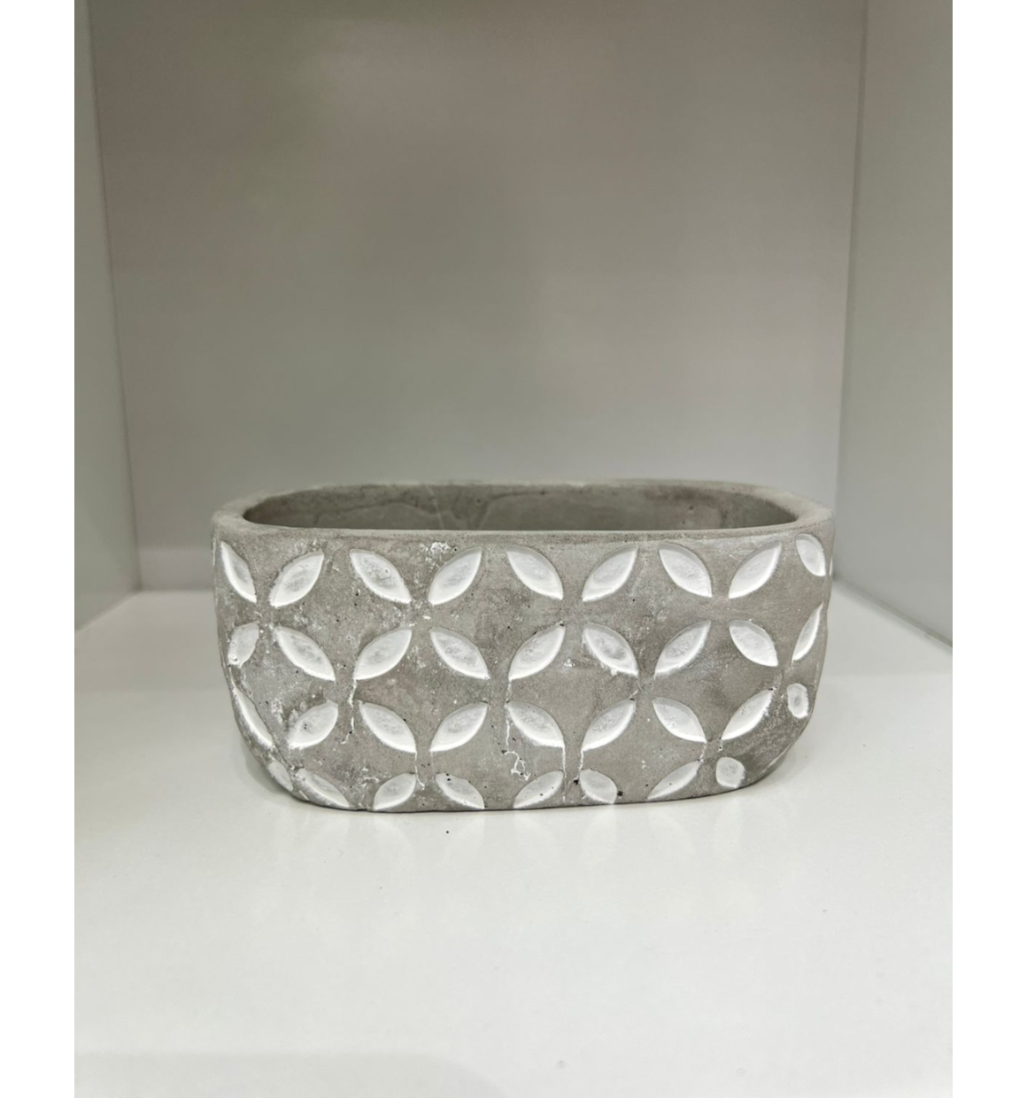 O Vaso de Cimento Decoração Oval Florzinha tem acabamento rústico, formato oval e parte externa decorada com flores brancas. Um charme!