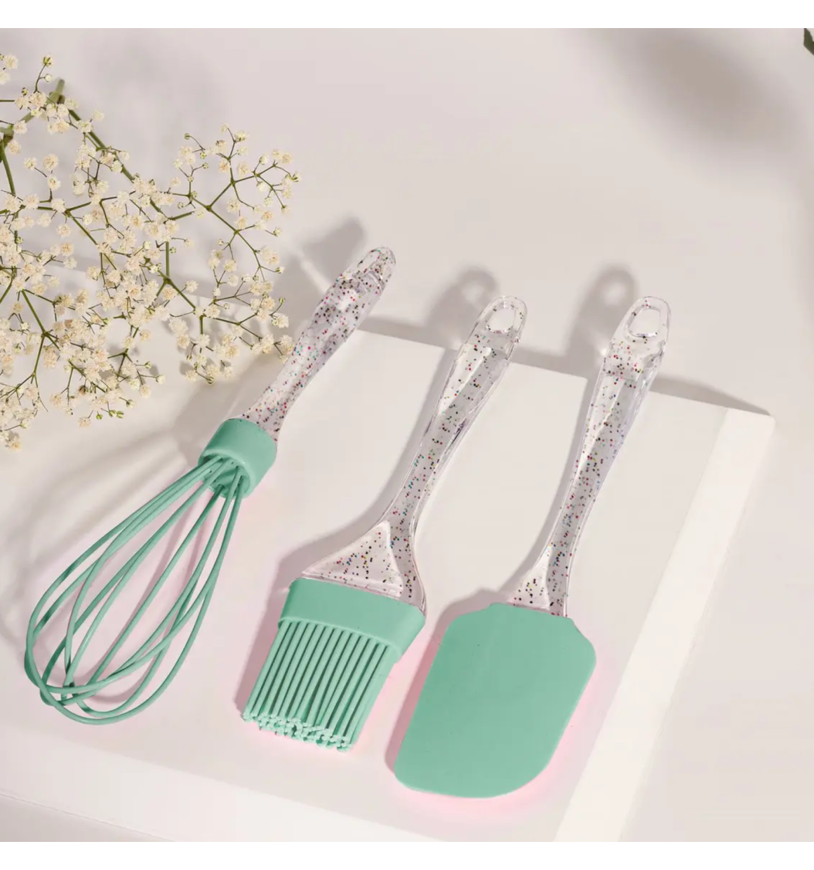 Kit de utensilio para cozinha acrílico com glitter e silicone 3 peças confeitaria,Lindo, prático, muito útil e versátil. O novo jogo de utensílios da COSY possui material resistente ao calor. É ideal para utilizar em panelas com revestimentos antiaderentes, pois não danifica o fundo. Um acessório com o charme e praticidade que sua cozinha precisa.