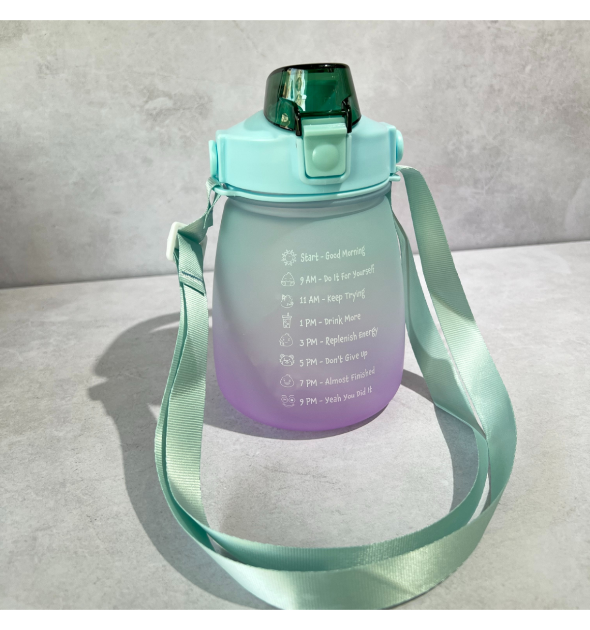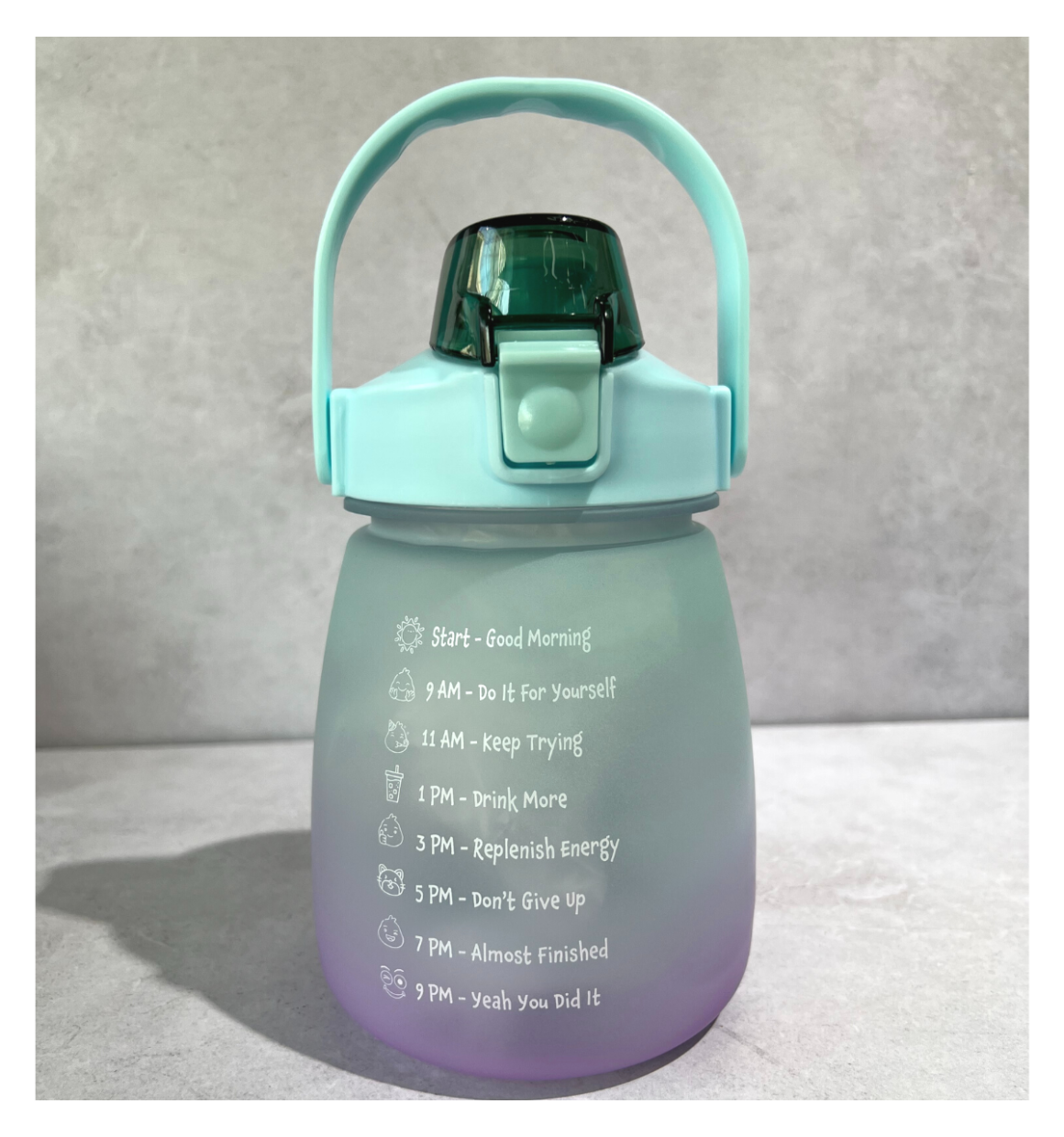 Projetada com marcador do tempo e citações inspiracionais, esta garrafa de água é perfeita para ajudar você se manter motivado para beber água suficiente durante todo o dia. Apresentado com aspecto em degradê e escala de capacidade ajuda você medir sua ingestão diária de água de água com facilidade e claramente. É divertido e fácil para qualquer objetivo de fitness incluindo perda de peso, ganho muscular, controle de apetite e saúde geral.