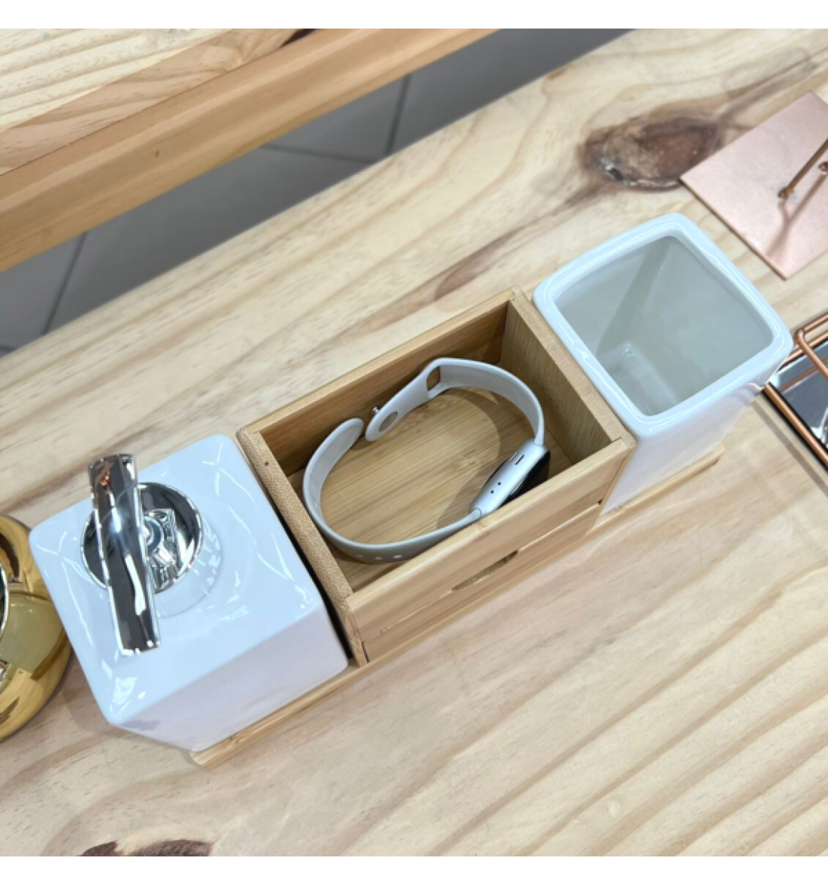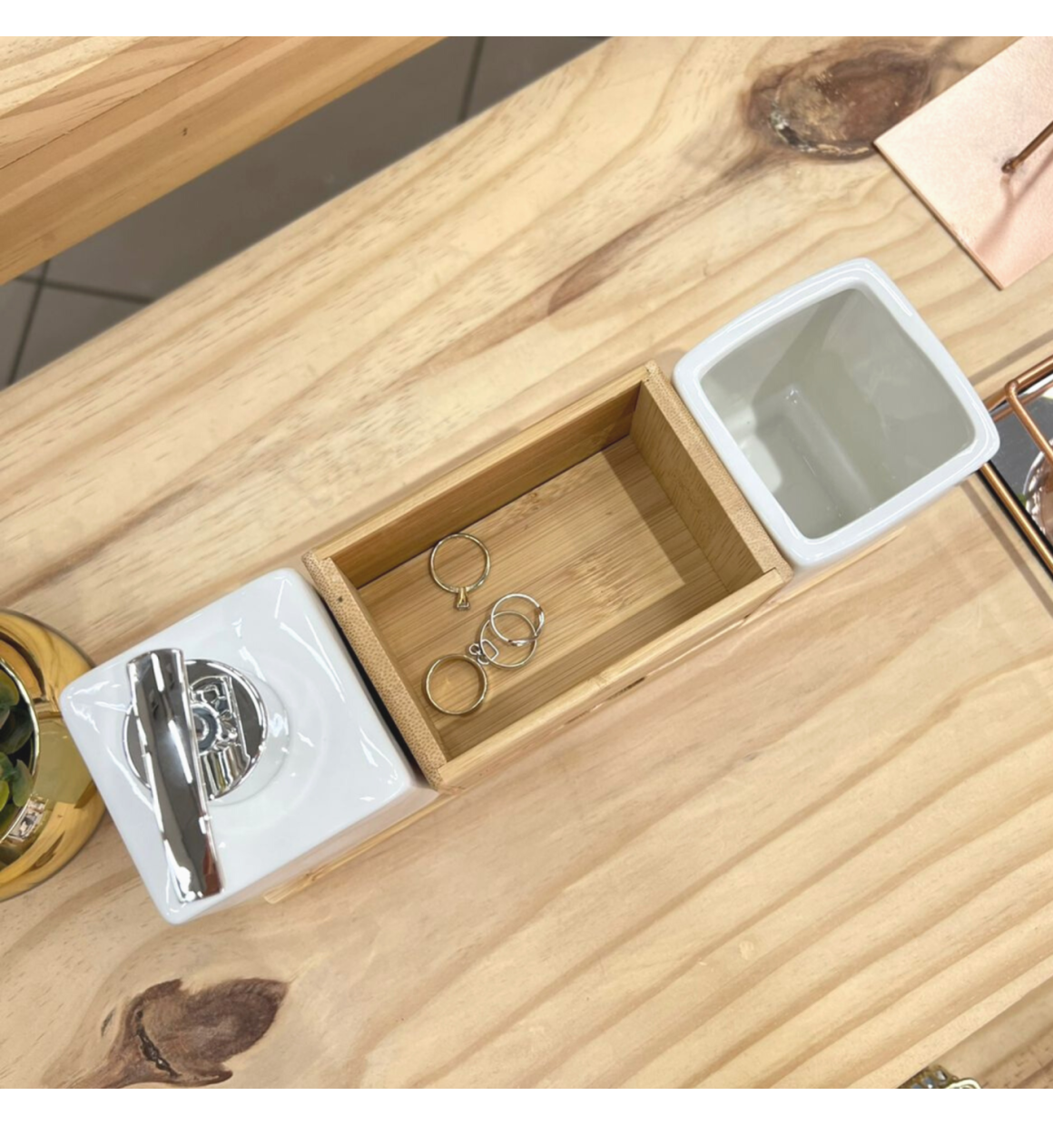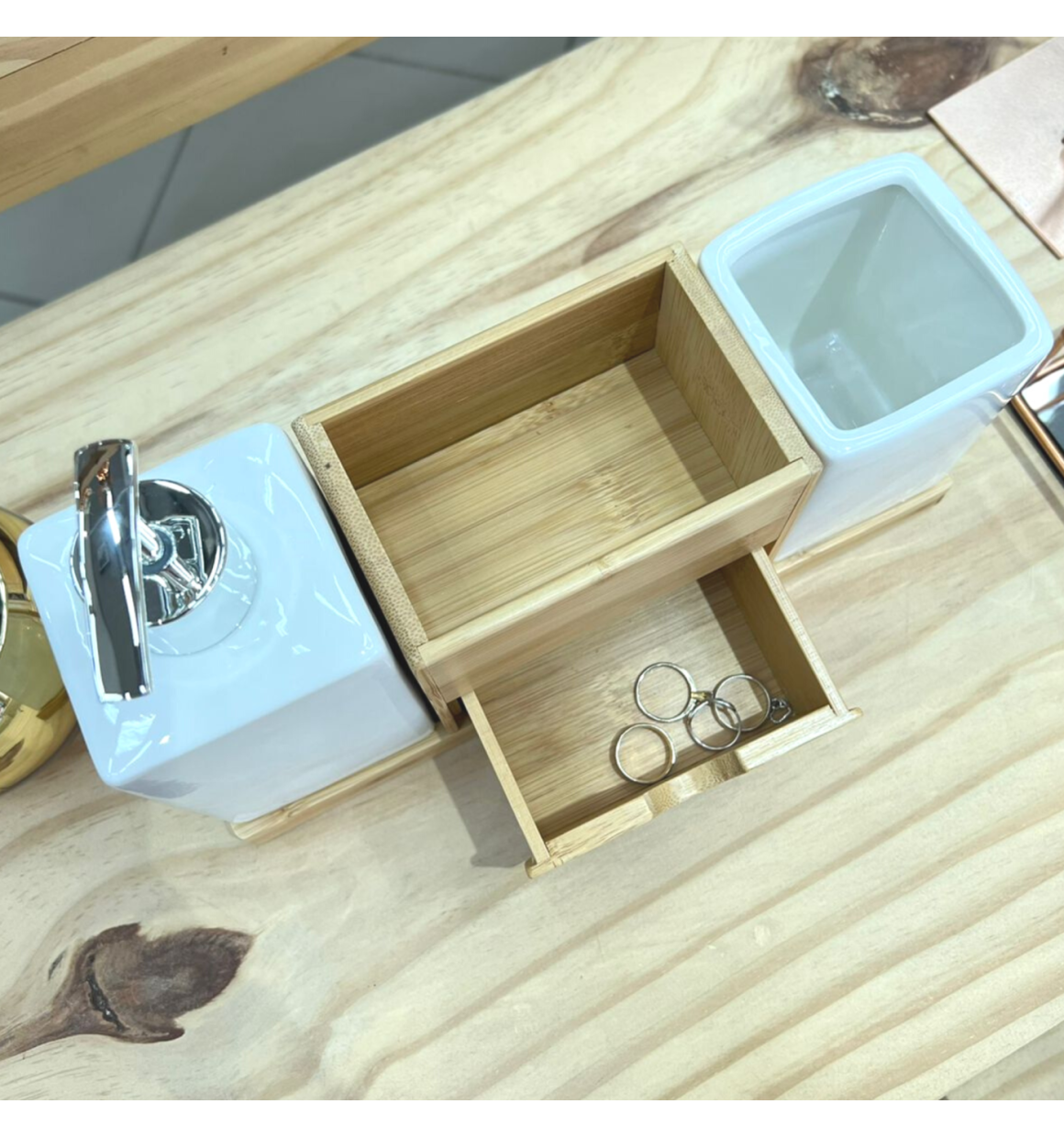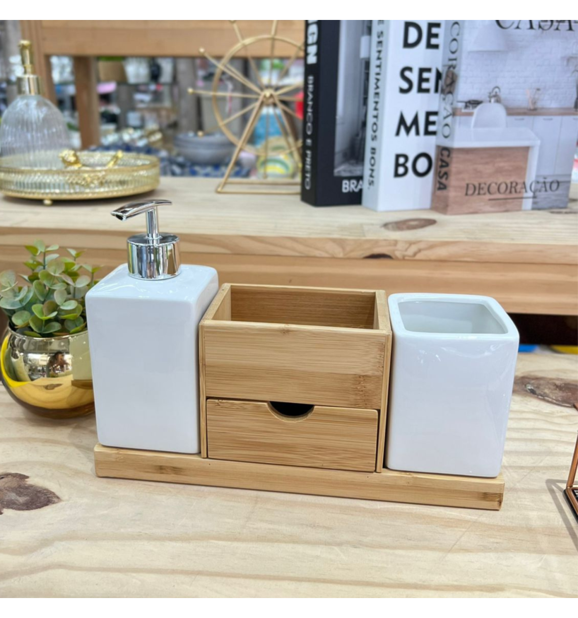 Elegante e prático, este jogo de banheiro dará um toque de modernidade ao seu banheiro. Composto por um porta sabonete liquido,um porta objetos de bambu com 2 gavetas e um copo. Compacto, este conjunto é ideal para pequenos espaços. Também pode ser desmontado e assim usar a base como uma pequena bandeja para bijuterias ou outros pequenos objetos do dia a dia.