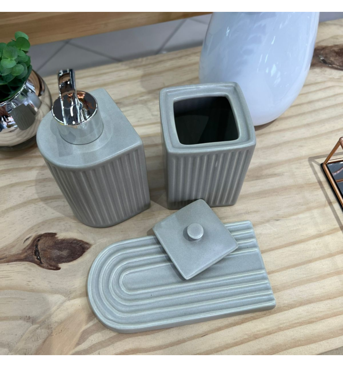 Jogo Banheiro Nude com Listras 3 Peças de Porcelana.
