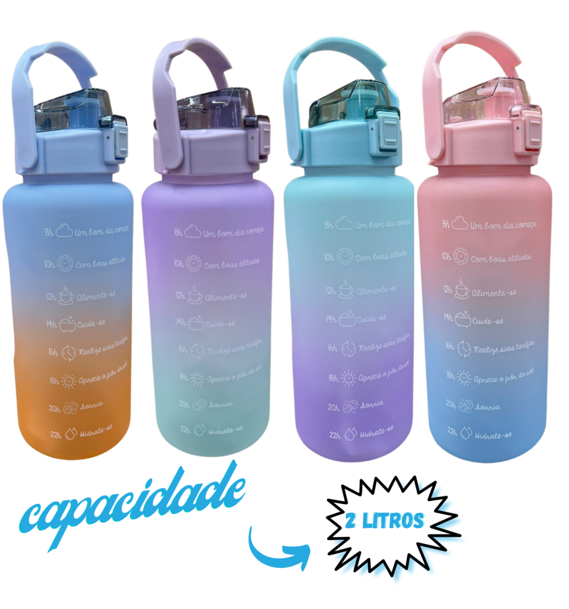 Projetada com marcador do tempo e citações inspiracionais, esta garrafa de água é perfeita para ajudar você se manter motivado para beber água suficiente durante todo o dia. Apresentado com aspecto em degradê e escala de capacidade ajuda você medir sua ingestão diária de água de água com facilidade e claramente. É divertido e fácil para qualquer objetivo de fitness incluindo perda de peso, ganho muscular, controle de apetite e saúde geral.
