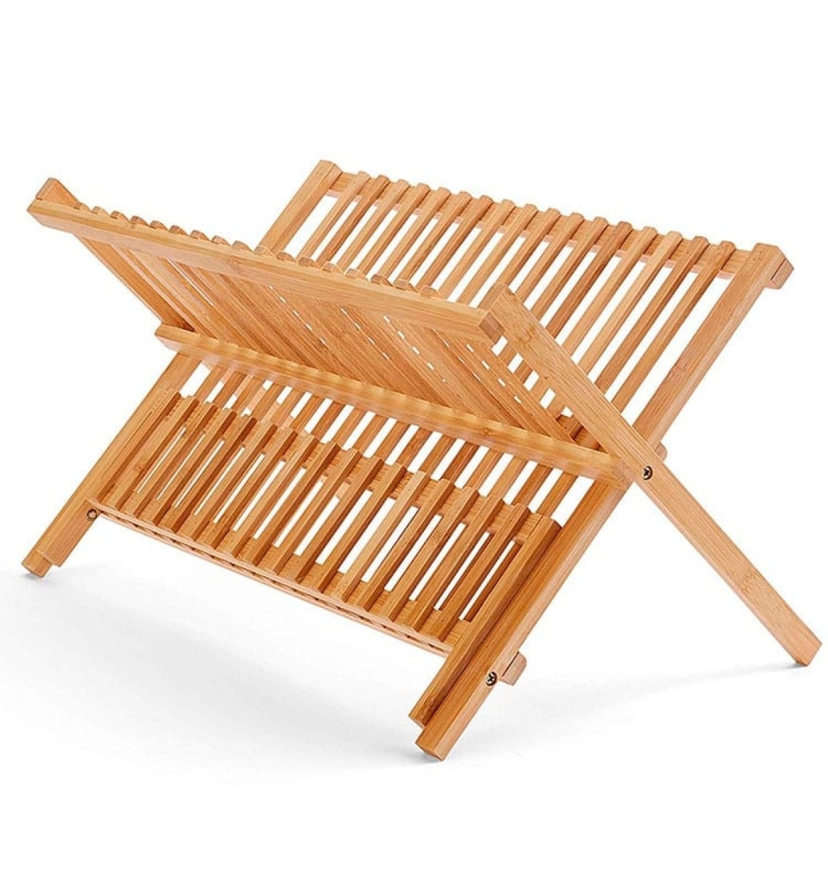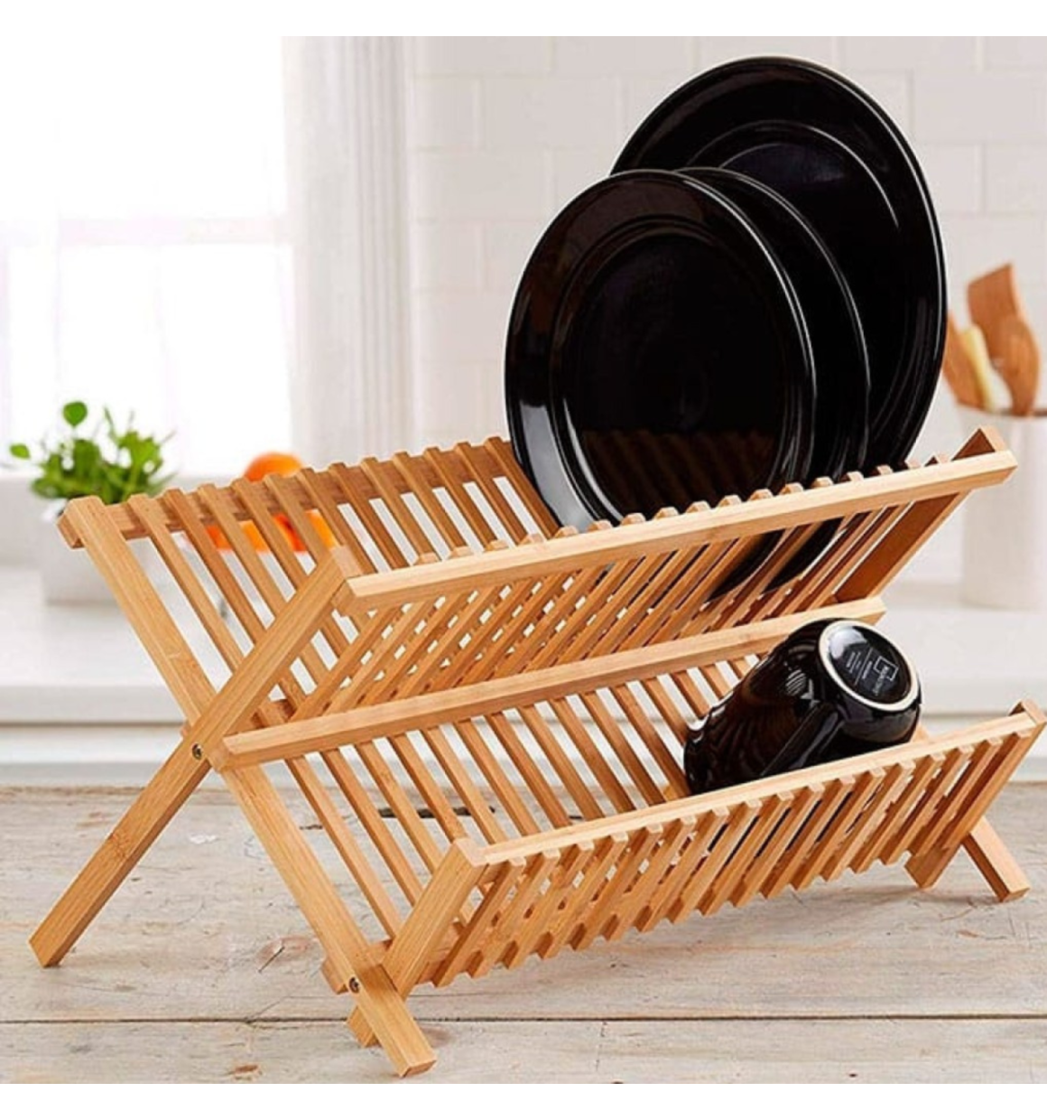 Escorredor de louças, dobrável, em bambu. Possui proteção antibacteriana.