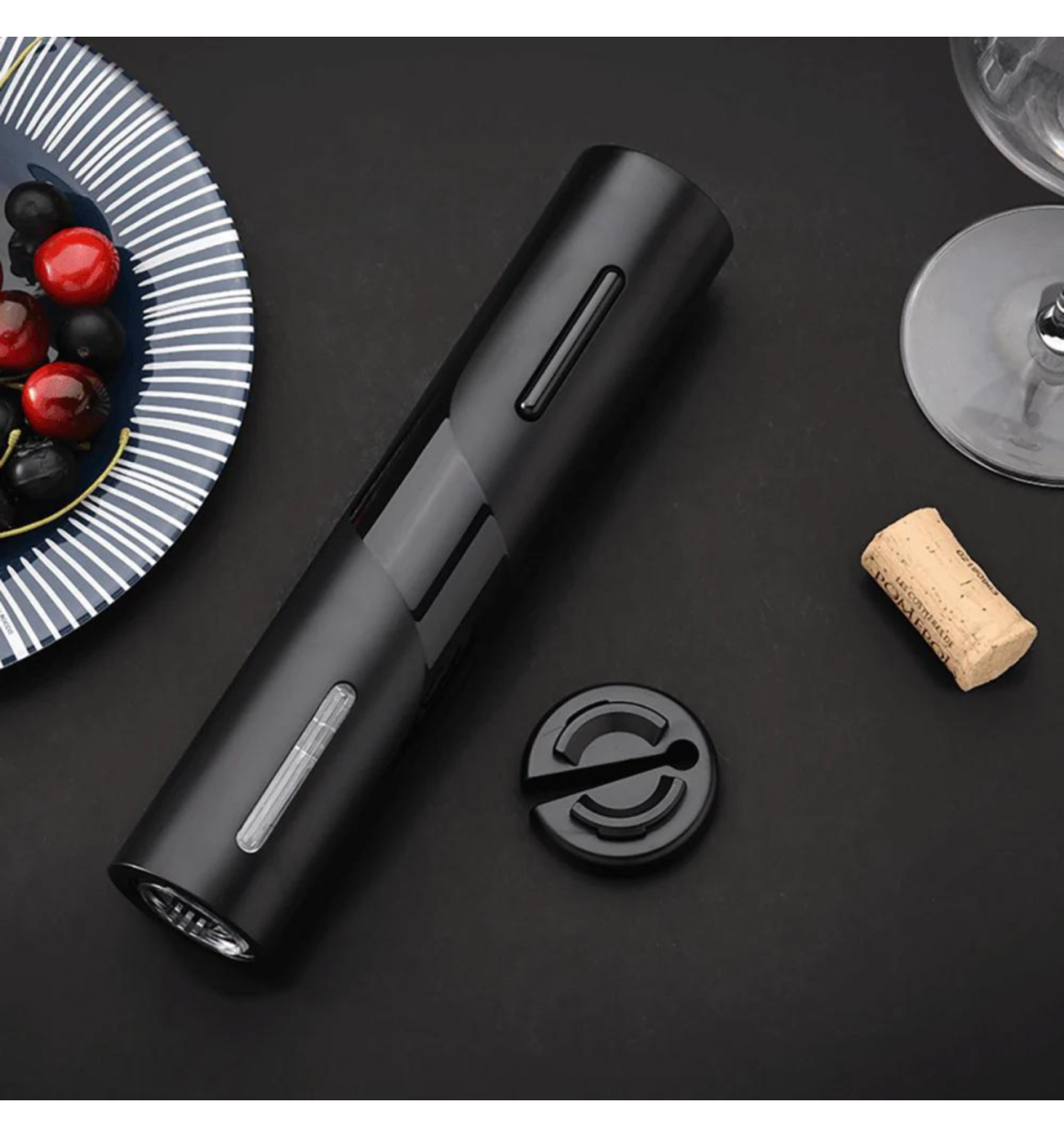 O Abridor de vinhos automático possui um punho ergonômico para fácil manuseio projetado para caber em todas as garrafas de vinho tradicionais, basta clicar no botão e a rolha é removida automaticamente com as mãos livres