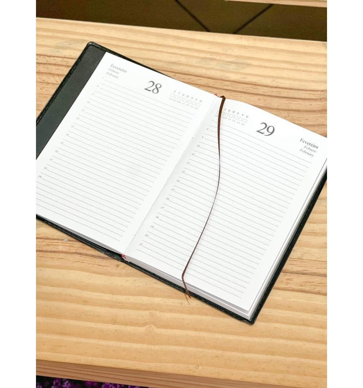 Agenda diária com material de toque macio para acompanhar o ano sem perder nada. Ideal para carregar na bolsa ou na mala para qualquer lugar.
