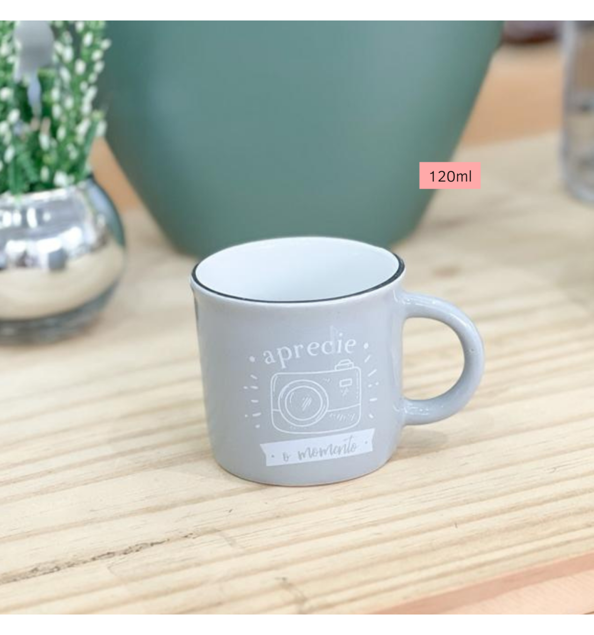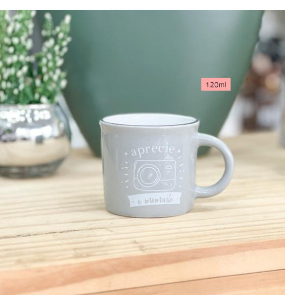 Caneca de Porcelana Cinza "Aprecie o Momento"