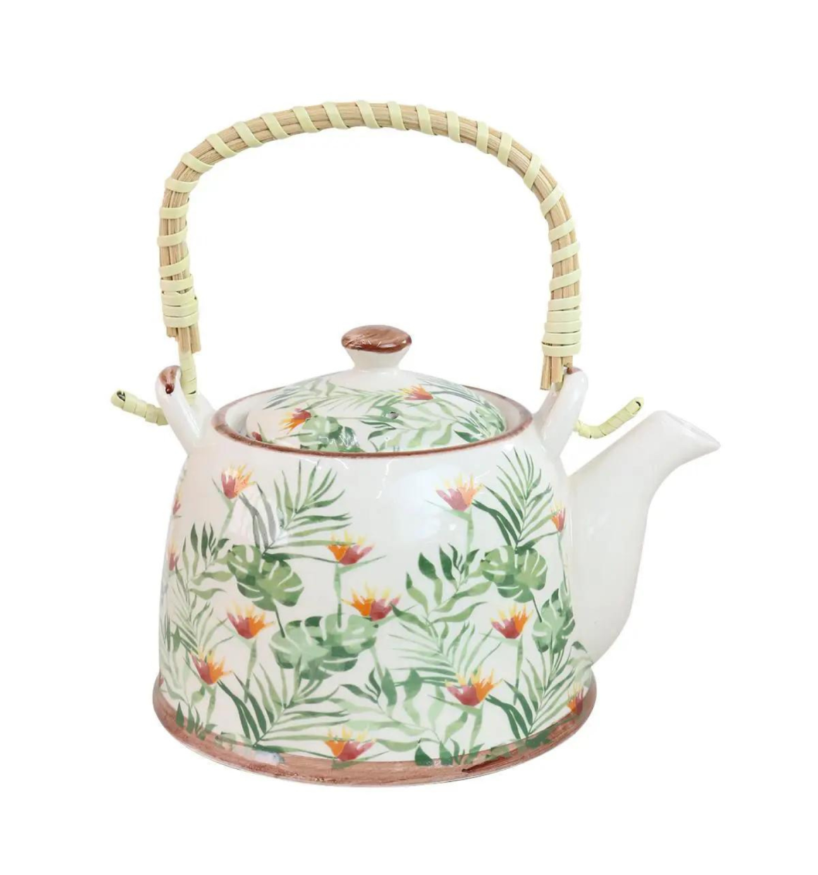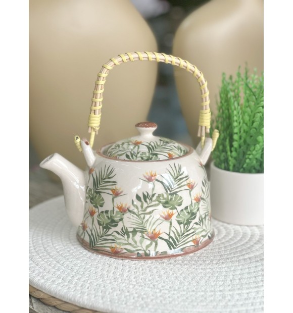 Bule de porcelana decorativa estilo oriental com alça de bambu trançado. acompanha tampa e infusor que se encaixa na borda, facilitando o preparo do chá. Alça e coador removivel para lavagem.