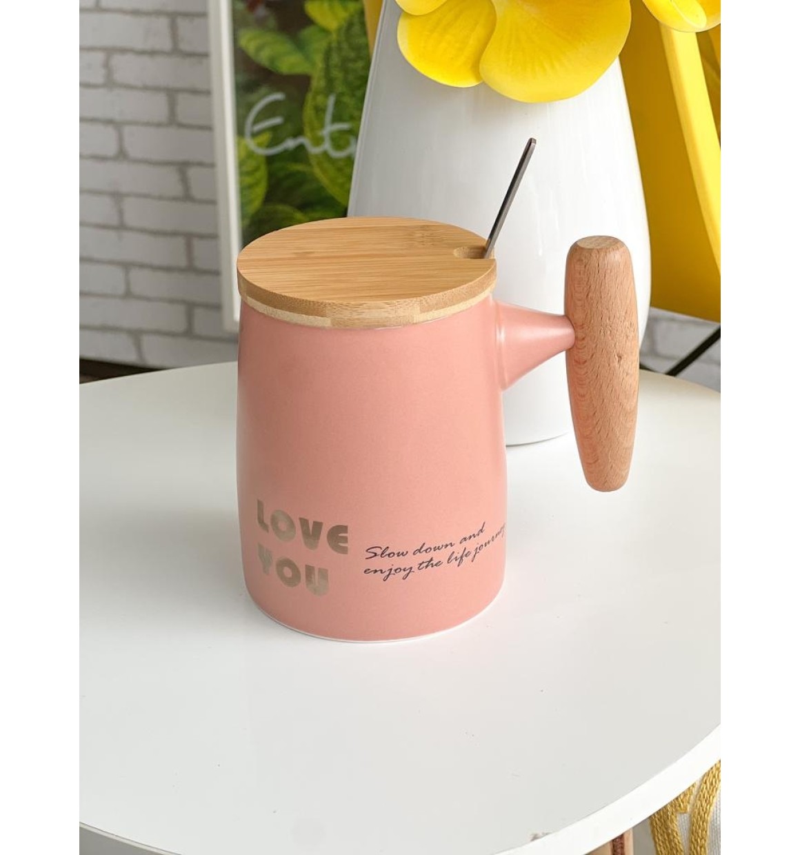 Caneca Salmão de Cerâmica com Tampa de Bambu 350ml