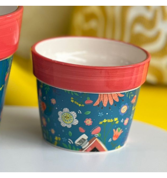 Vaso em Porcelana , fundo em branco e borda em Vermelho , decorado com florzinhas . Não há furos no fundo do vaso. Indicado apenas para uso interno, devido ao tipo de pintura/material