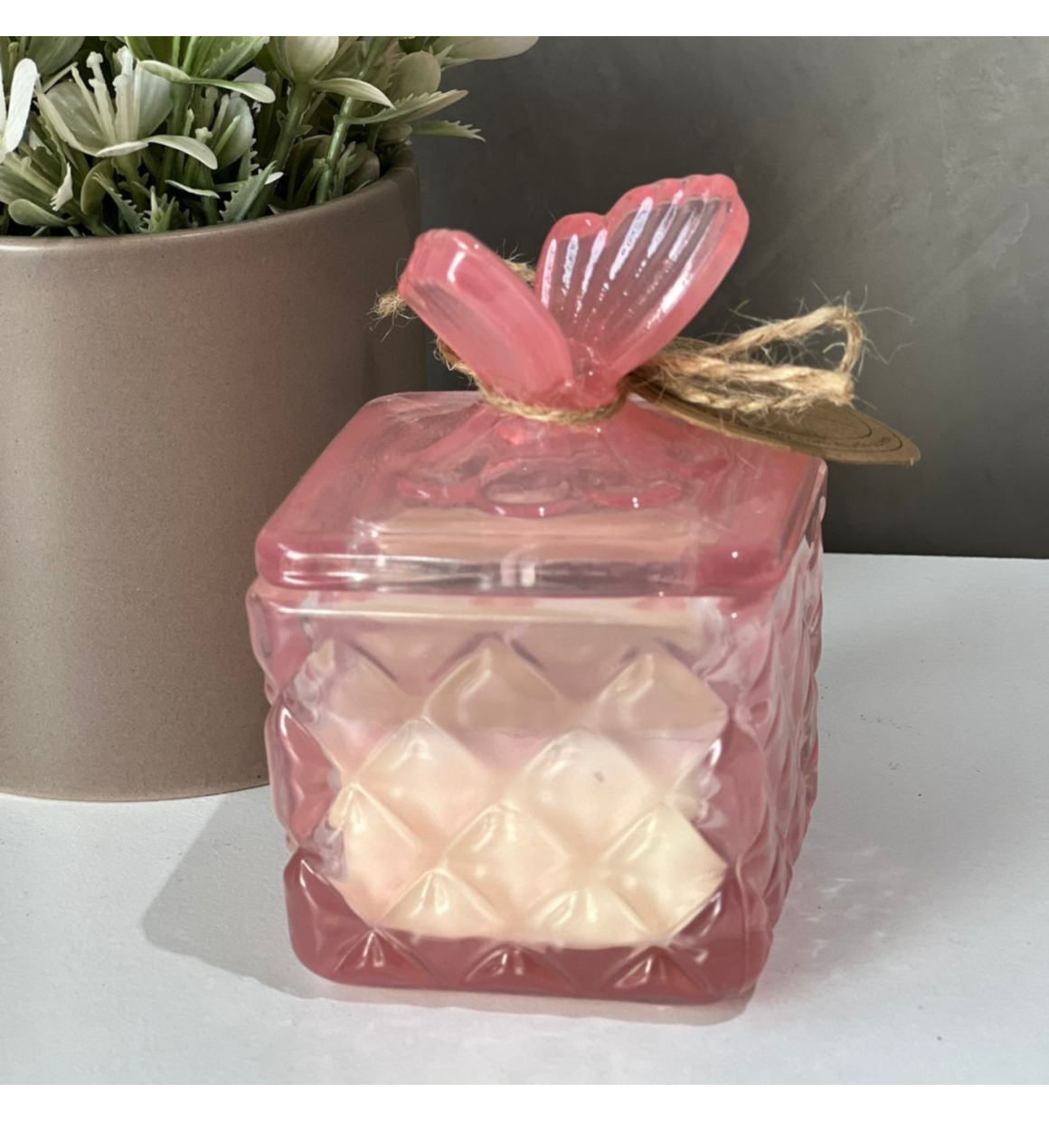 Vela Aromática com Castiçal Rosa e Tampa com Borboleta