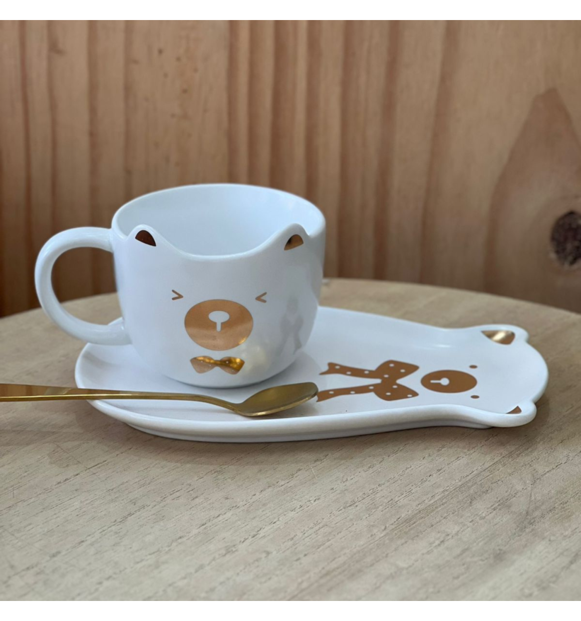 Xicara de Cerâmica Branca ''Ursinho'' com Pires + Colher - 220ml