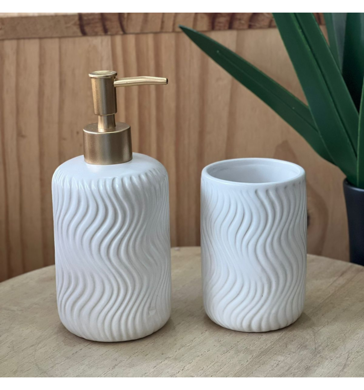 Kit de Banheiro Branco com Tampa Dourada - Elegância e Funcionalidade em Cerâmica!