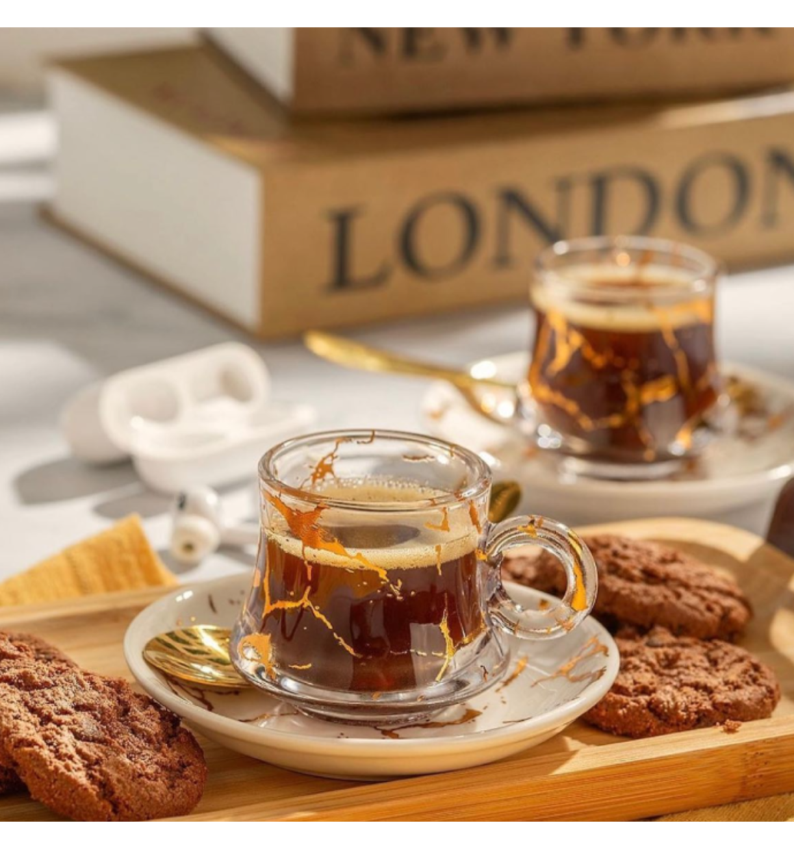2. Xicara de Vidro com Pires de Porcelana Marmorizada - 60ml