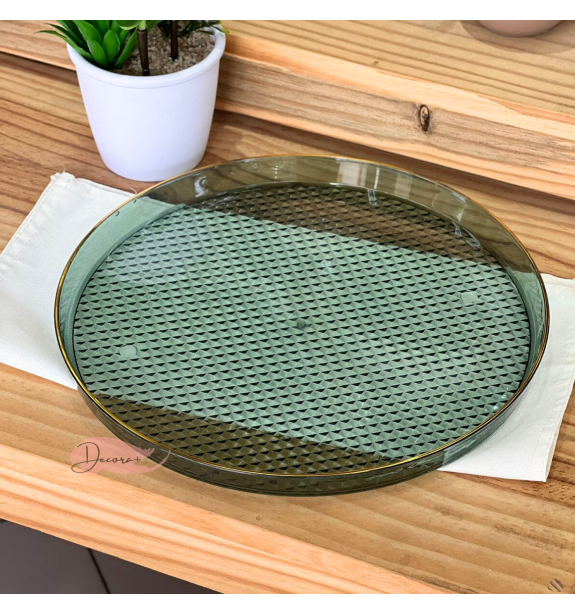 Eleve o seu senso de estilo com esta bandeja única. Compre a Bandeja Verde Redonda com borda Dourada (G) hoje e faça uma declaração de elegância