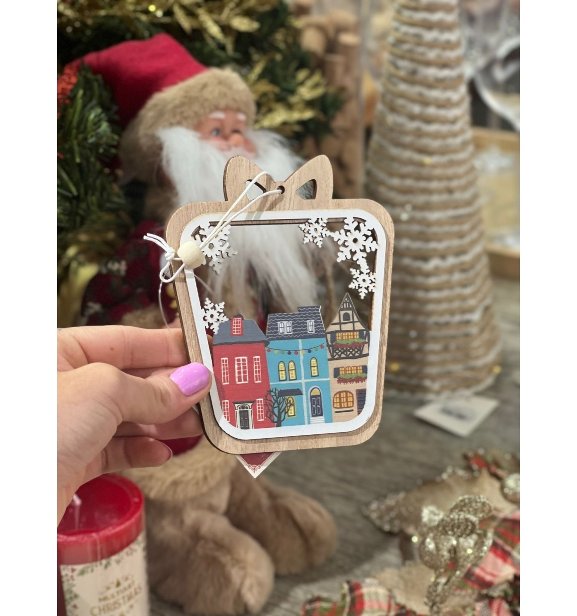 Este Enfeite de Natal em formato de Caixa de Presente em MDF é mais do que parece. Com casinhas encantadoras por dentro, ele é um convite para explorar a magia do Natal em miniatura. Suas medidas de 12cm x 10cm o tornam uma adição perfeita à sua decoração.