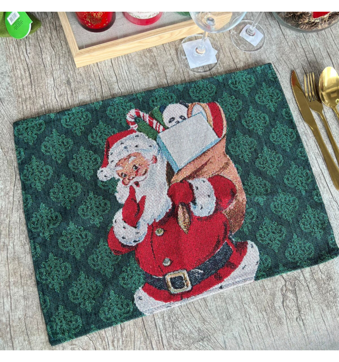 Celebre o Natal com estilo à mesa. Adquira o Jogo Americano de Tecido 'Papai Noel com Saco de Presente Verde' agora e compartilhe a magia festiva com seus convidados.