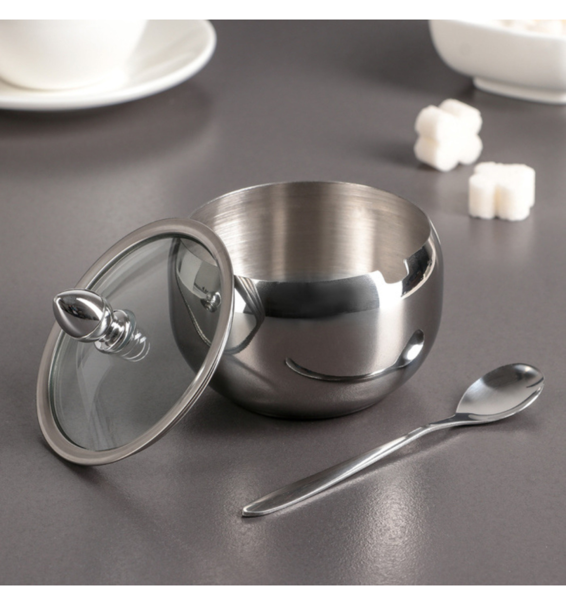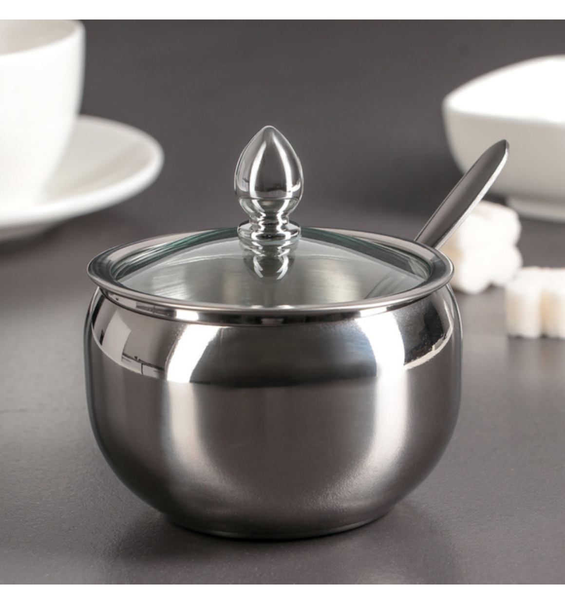 Sabor e estilo em cada detalhe. Adquira agora o Açucareiro de Inox com Tampa de Vidro e Colher em Inox de 8,5cm e experimente o melhor da alta gastronomia em casa.