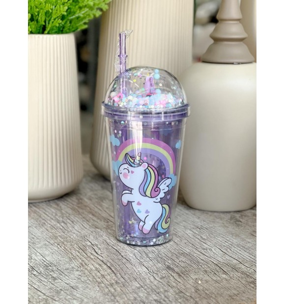 Copo Unicórnio de Plástico com Canudo Mod.1 Lilas - 450ml