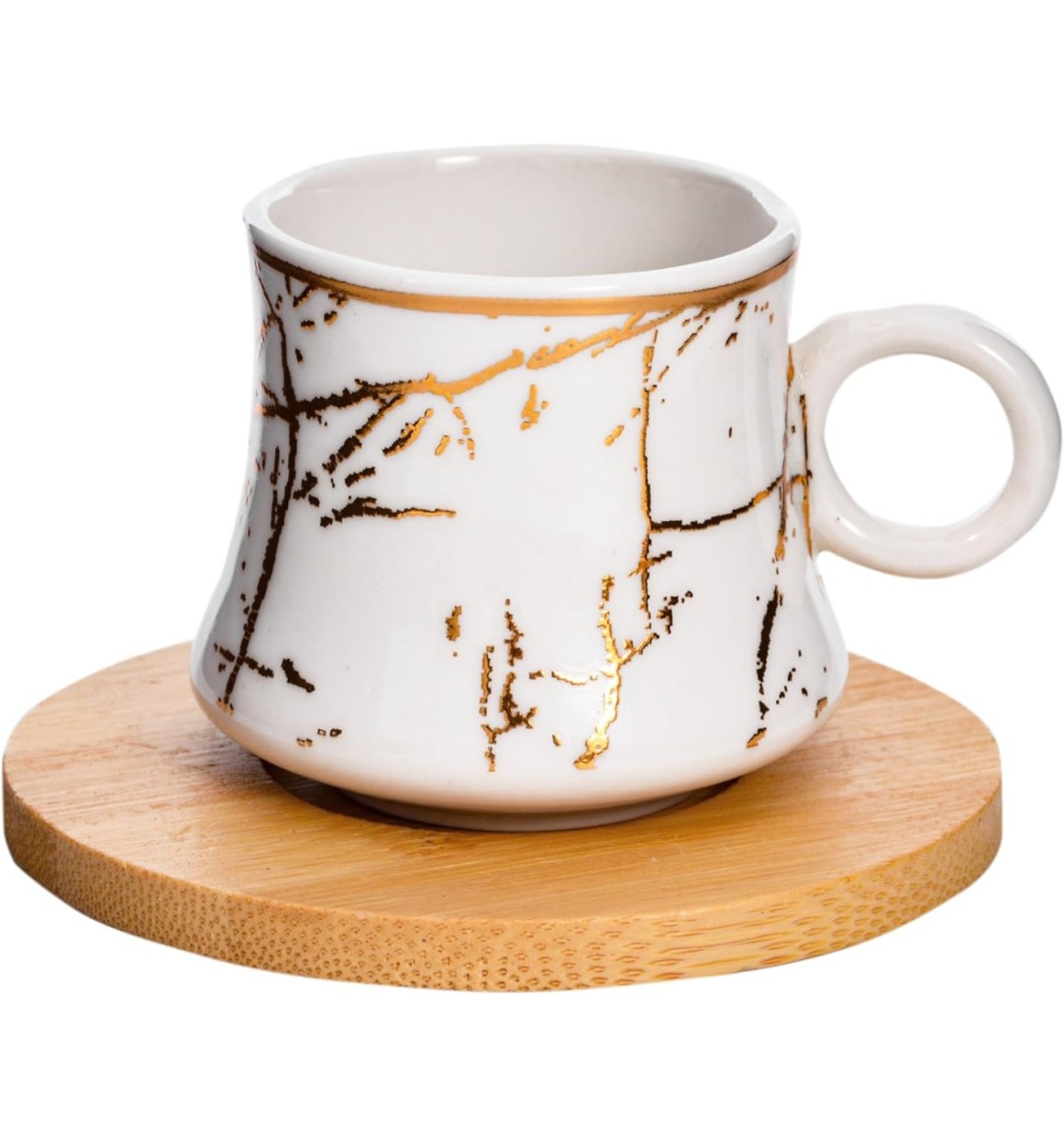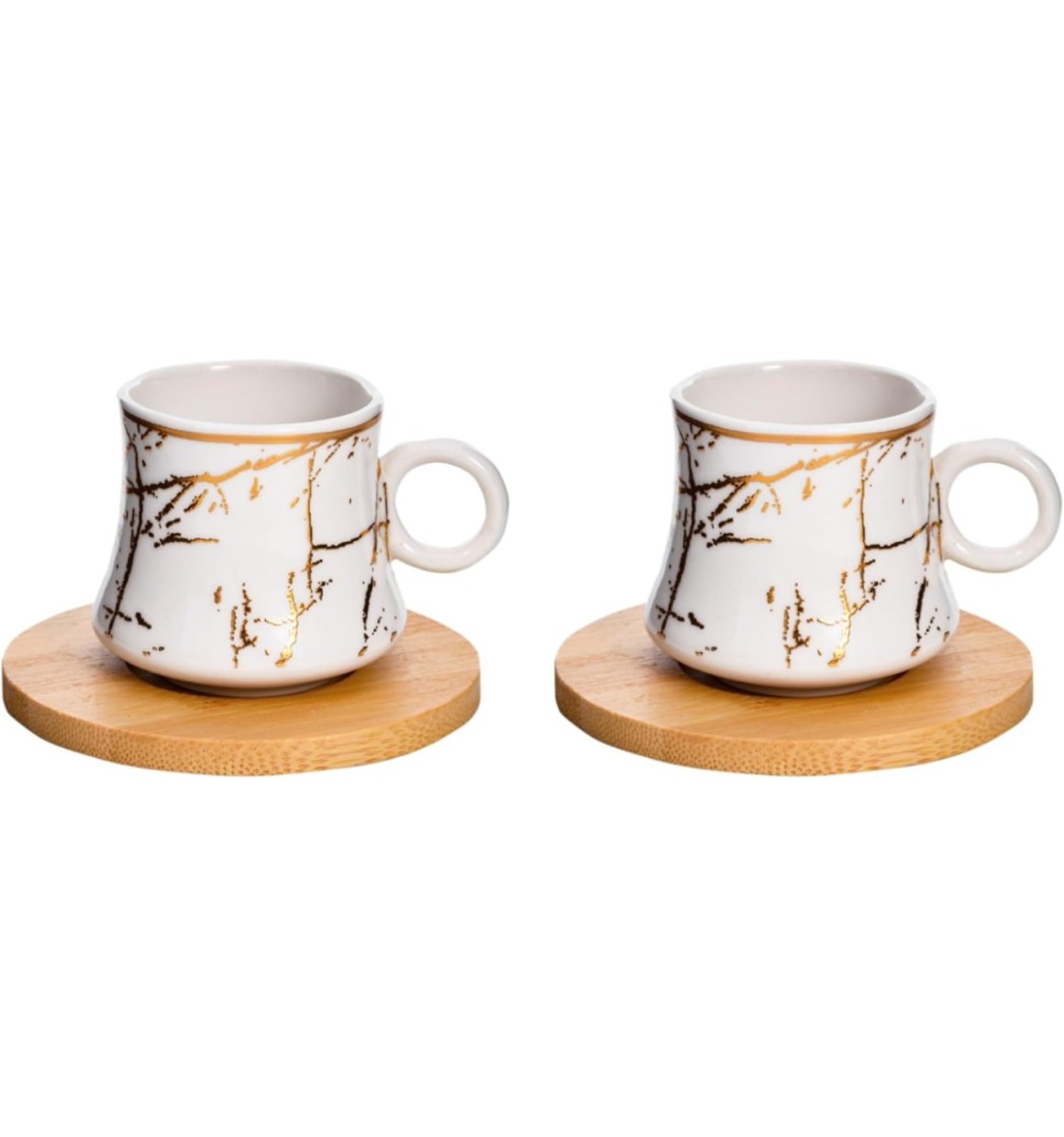 Conjunto de Xícaras Porcelana com Pires Bambu Normay, composto por 2 xícaras Brancas com Dourado e 2 Pires de Bambu.
