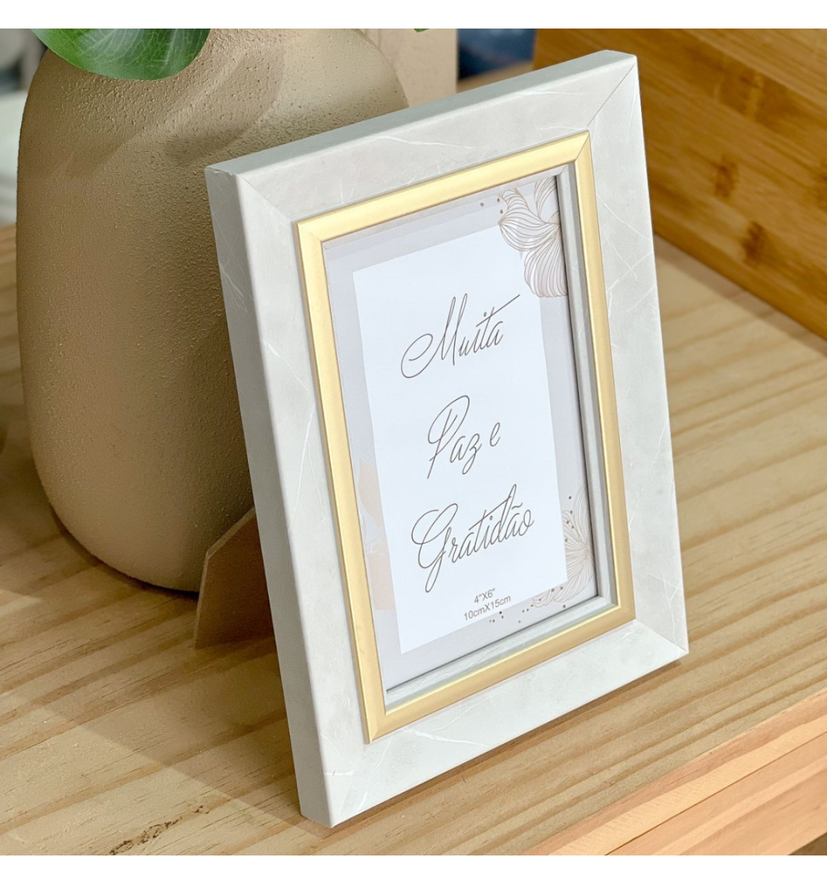 2. Porta Retrato Bege "Muita Paz e Gratidão" 10cm X 15cm