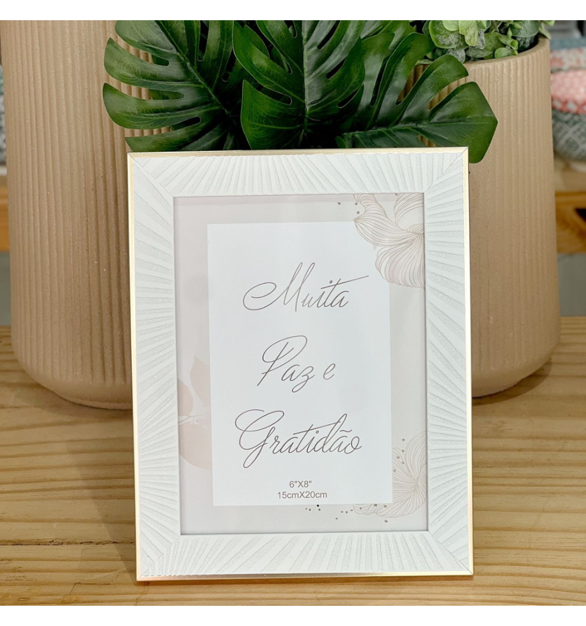 2. Porta Retrato Branco com Moldura Dourada "Muita Paz e Gratidão" 15cm X 20cm