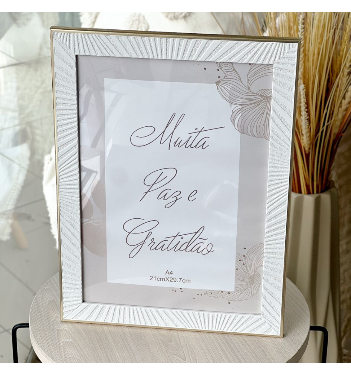 Porta Retrato Branco c/ Moldura Dourada "Muita , Paz e Gratidão" A4 - 21cm X 29.7cm