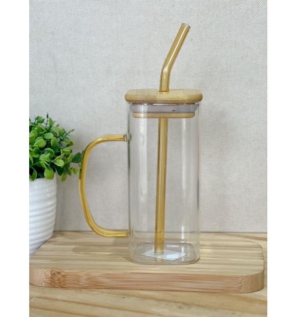 Caneca de Vidro c\ Canudo e Tampa de Bambu 400ml Amarela
