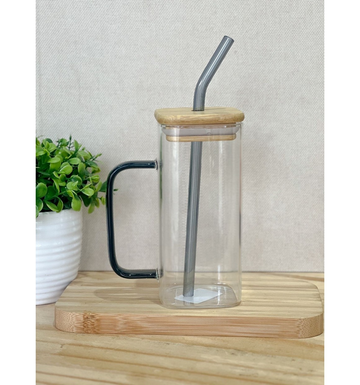 Caneca de Vidro c\ Canudo e Tampa de Bambu 400ml